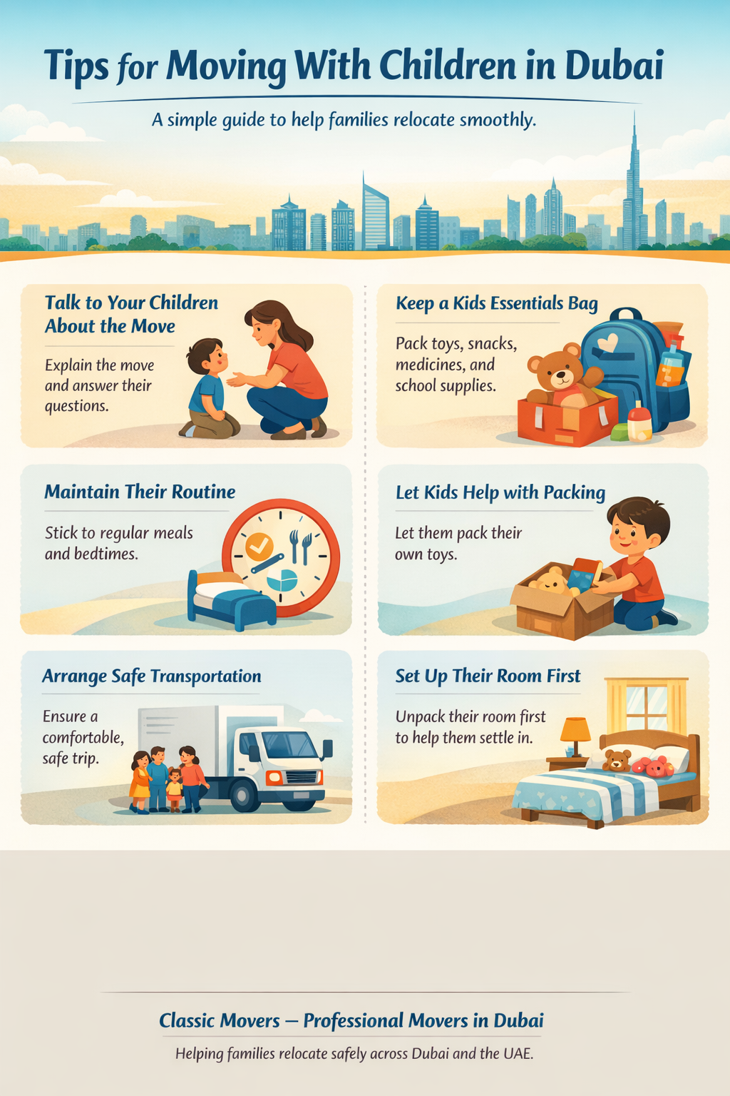 Tell your kids why you're moving, and let them help with simple tasks like labeling boxes or picking out new colors for their rooms. If you can, visit your new neighborhood before you move so you can get used to it. Show them parks, schools, and stores close by to get them excited. Classic Movers Dubai knows that moving with your family is just as much about emotions as it is about moving things. Our crew makes sure that the procedure is calm and stress-free for everyone.