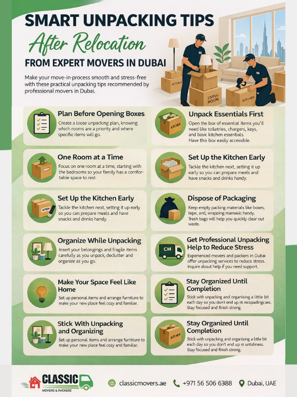 If unpacking seems too hard, you could choose to hire experienced movers and packers in Dubai, like Classic Movers. Their staff can help with more than just packing and moving. They can also help you unpack and set up your furniture in an organized way.