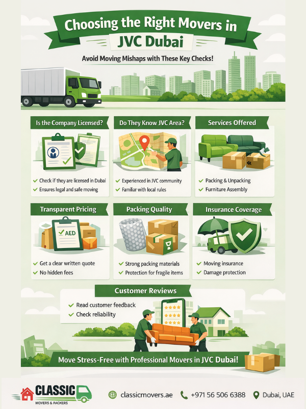 Hiring the right moving company can make a huge difference in your relocation experience. By checking licenses, local experience, services, pricing transparency, insurance, and customer reviews, you can avoid common moving problems and enjoy a smooth relocation. “Some residents choose cheap movers packers in Downtown Dubai without checking reviews or service quality, which can lead to damaged belongings.” So, if you are looking for professional, licensed, and reliable movers and packers in JVC Dubai, Classic Movers offers complete moving solutions designed around your needs.